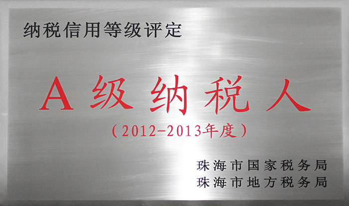 近日,珠海市国税局、地税局根据纳税人的纳税信用等级,评定我司为2012至2013年度《A级纳税人(2012-2013年度)》。