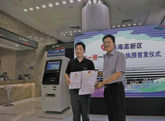 8月18日上午,公司自主研发的新一代产品“AGM多功能自助行政服务终端”首发仪式暨珠海市高新区“一照一码”营业执照首发仪式,在南方软件园商事登记服务大厅举行。珠海市副市长、高新区管委会主任及工商行政管理部门领导和多家媒体参加了此次仪式。