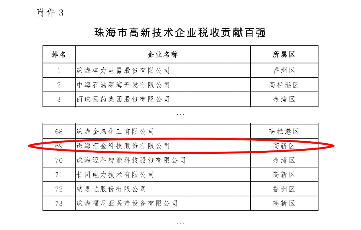On October 26, according to the evaluation of Technology and Information Bureau of Zhuhai, Huijin Technology was listed among "2018 Top 100 Outstanding Enterprises of Zhuhai for Comprehensive Innovation Capacity and Tax Contribution".