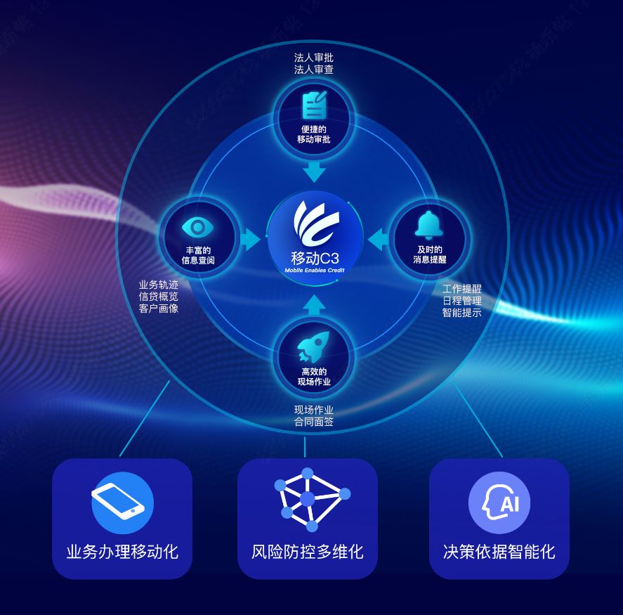 移动C3是依托互联网移动技术,采取先进安全防护策略,在用户自有手机上运行C3系统的App软件,秉承“移动赋能信贷”的设计理念,定位服务于信用管理领域,聚焦信贷人员移动操作场景,打破业务处理的时空界线,助推构建PC端、移动端相融合的信用管理作业体系。